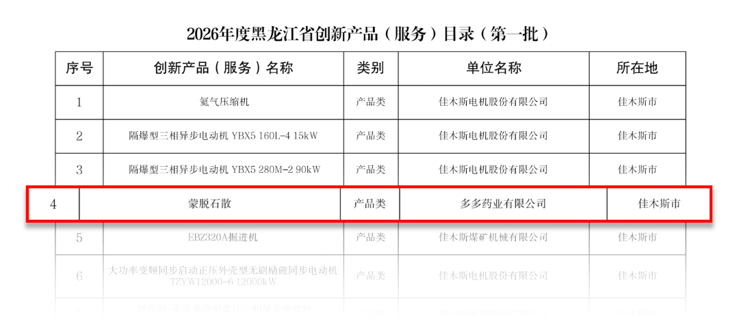 近日,黑龍江省工業和信息化廳公布《2026年度黑龍江省創(chuàng)新産(chǎn)品(服務)目錄》(第一批),中關村科技旗下多多藥業有限公司(以下簡稱:多多藥業)産品蒙脫石散成功入選。這一殊榮不僅标志著政府主管部門對多多藥業技術創新能力與産品臨床價值的高度認可,也充分展現瞭多多藥業長期堅持“以研促發、創新驅動”戰略所取得的積極成效。